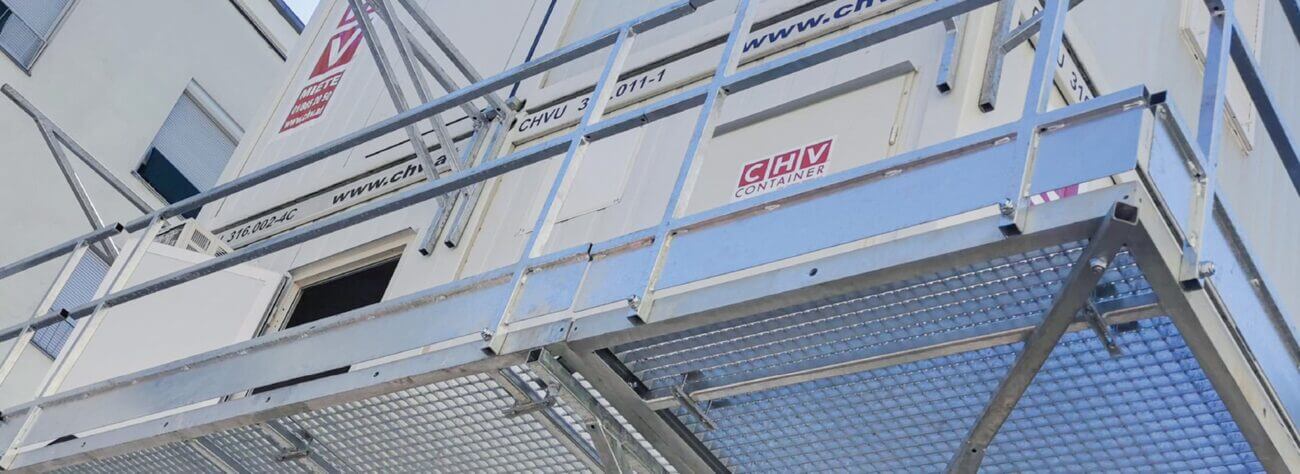 Der 1,20 m breite, modulare elea Containerzugang ermöglicht das schnelle und sichere Erschließen mehrstöckiger Baucontainer und erspart so aufwändige Holzkonstruktionen.
