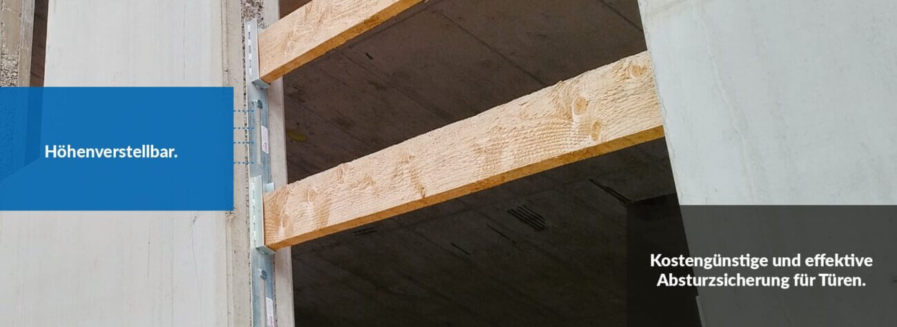 Mit der Absturzsicherung für Türen und drei bauseitigen Holzbrettern können Lift- und Türöffnungen problemlos gesichert werden. Dazu werden zwei Elemente mit je zwei Betonschrauben in die Leibung montiert. Kommt der Bodenaufbau werden die beiden Schienen ohne Demontage – und damit höchster Sicherheit – einfach nach oben geschoben und die Schrauben wieder festgezogen.
