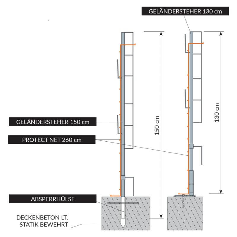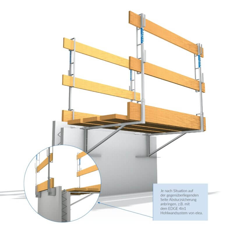 Für Absturzsicherung mittels Holzbretter oder PROTECT NET Seitenschutzgitter.