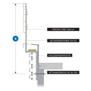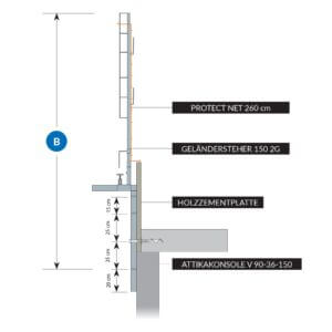 Maximale Nutzhöhe ab Anschlagspunkt 170 cm. Attikakonsole 34 oder V 35-36-150 in Verbindung mit Geländersteher 150 2G. Bei Distanz größer als 29 cm Gerüstbrett 250 x 50 mm einstreuen!